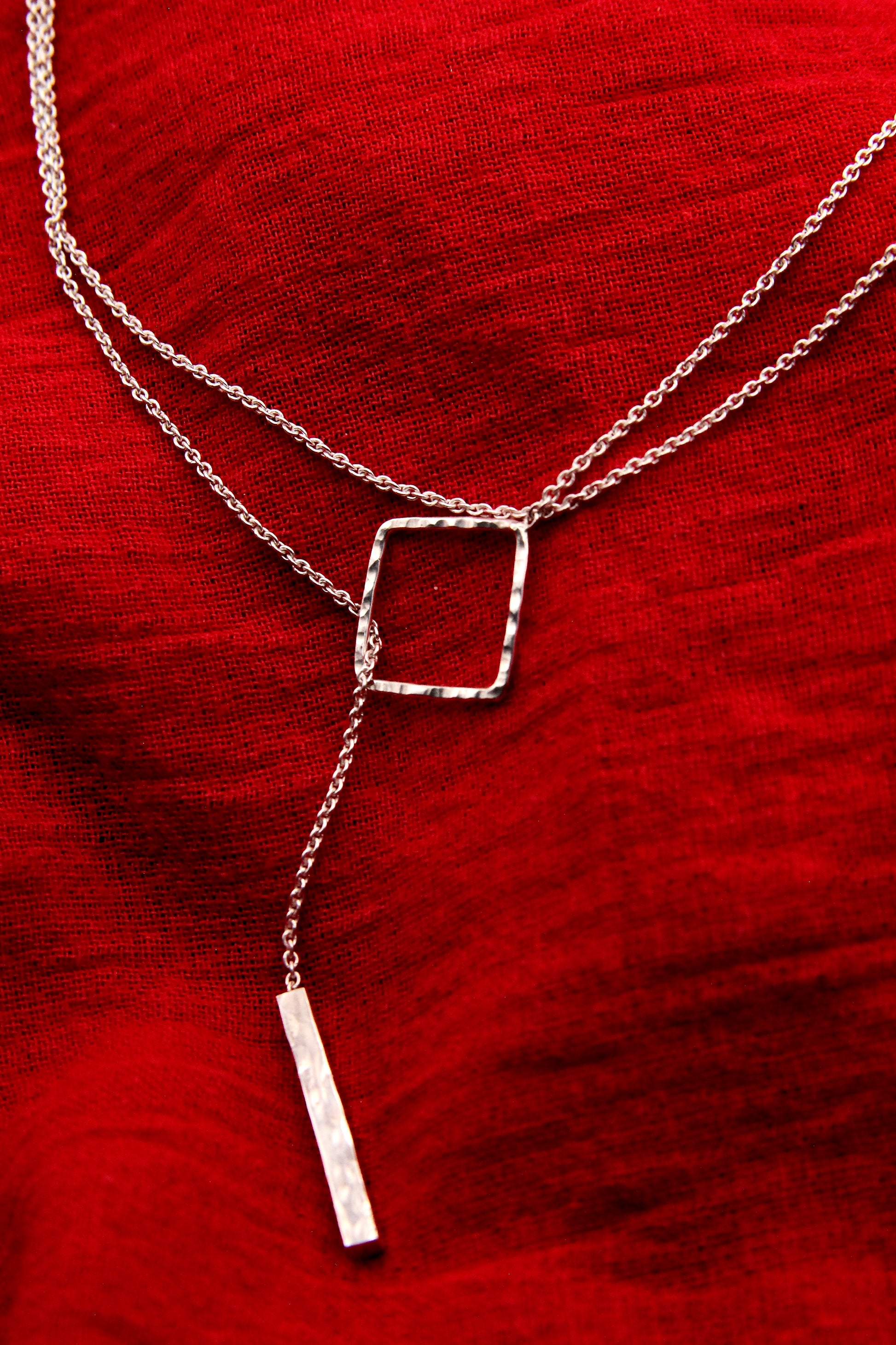 The Mull Necklace is a study of connection. A hammered bar slides through a geometric outline to secure the piece — no clasp, no excess. Designed to be worn in multiple ways, from high on the collarbone to low and fluid. A balance of simplicity and strength.
